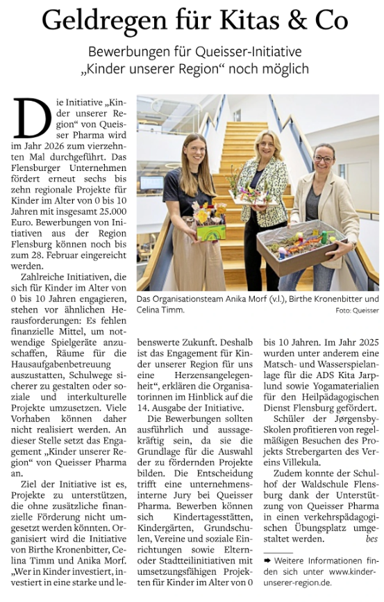 Die Initiative „Kinder unserer Region“ von Queisser Pharma wird im Jahr 2026 zum vierzehnten Mal durchgeführt. Das Flensburger Unternehmen fördert erneut sechs bis zehn regionale Projekte für Kinder im Alter von 0 bis 10 Jahren mit insgesamt 25.000 Euro. Bewerbungen von Initiativen aus der Region Flensburg können noch bis zum 28. Februar eingereicht werden.